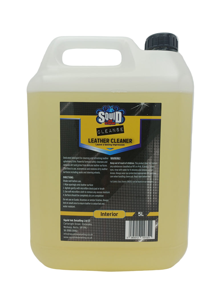 Squid Ink Cleanse is our dedicated leather detergent, now available in a cost-effective 5-litre bulk size for valeters, trade professionals, and detailing enthusiasts. It gently and safely removes dirt, grime, and body oils from leather upholstery, trims, and steering wheels while preserving the material’s natural finish.