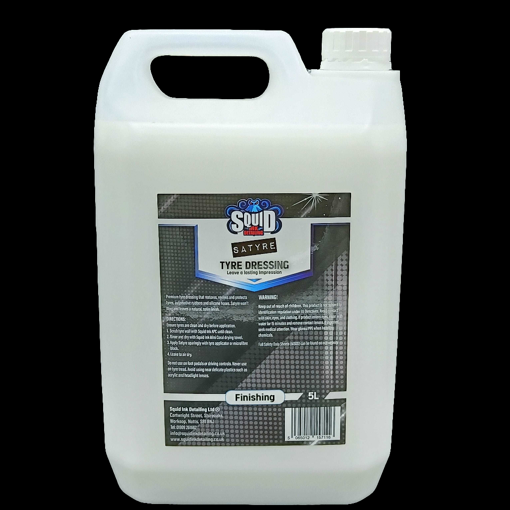 Squid Ink Satyre 5L bulk/trade size is our professional-grade silicone-based tyre dressing for workshops, fleet operators, and high-volume use. It leaves tyres with a natural satin finish while protecting against traffic film, moisture, dust, and UV damage.